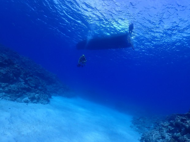 気温32℃ 水温29.5℃ 透明度40~10m今日スタートはこんな眺めでしたが。 いよいよ台風影響のうねりが到達。 そして、浅場はびっくりするぐらいの濁り。 悩ましい状況の中、それでも3ダイブ楽しみました。 さて、明日は?明後日以降は?? 台風情報に要注視です。