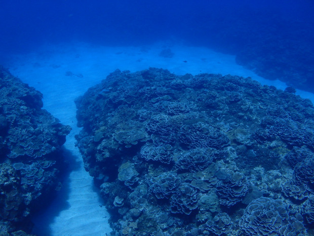 座間味島の北側ポイント「由比ケ浜」では、一面のサンゴを眺めました。