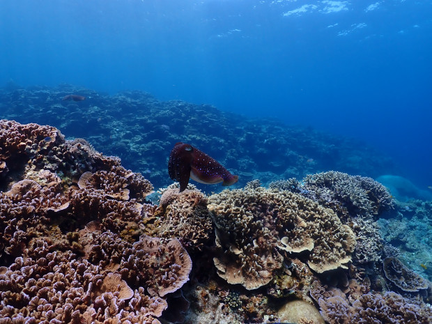 大型の甲イカ・コブシメが見頃!サンゴエリアに複数集合。ケラマ海域ファンダイビング