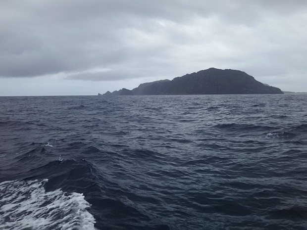 島際を航行しているのに、激しく降る雨に視界を邪魔されて、島の形がほんのうっすら見える程度。