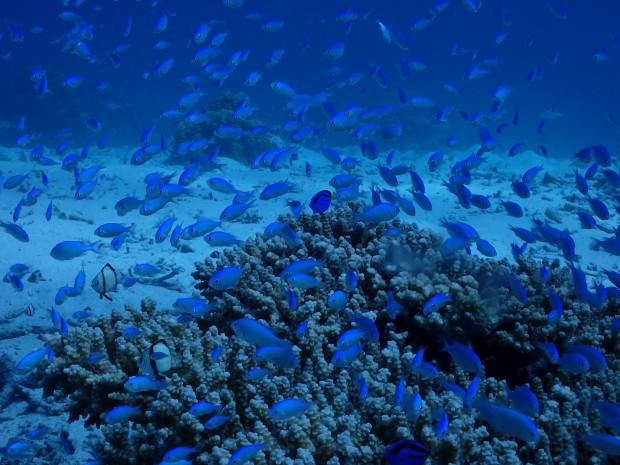 サンゴが豊富、ミルフィーユ状態で!水温は28.5度の場所も・ライトスーツでOK