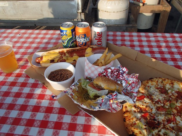 屋台であれこれ調達してきたら、テーブル&イスに陣取り、青空の下、皆でアメリカンフードパーティー★